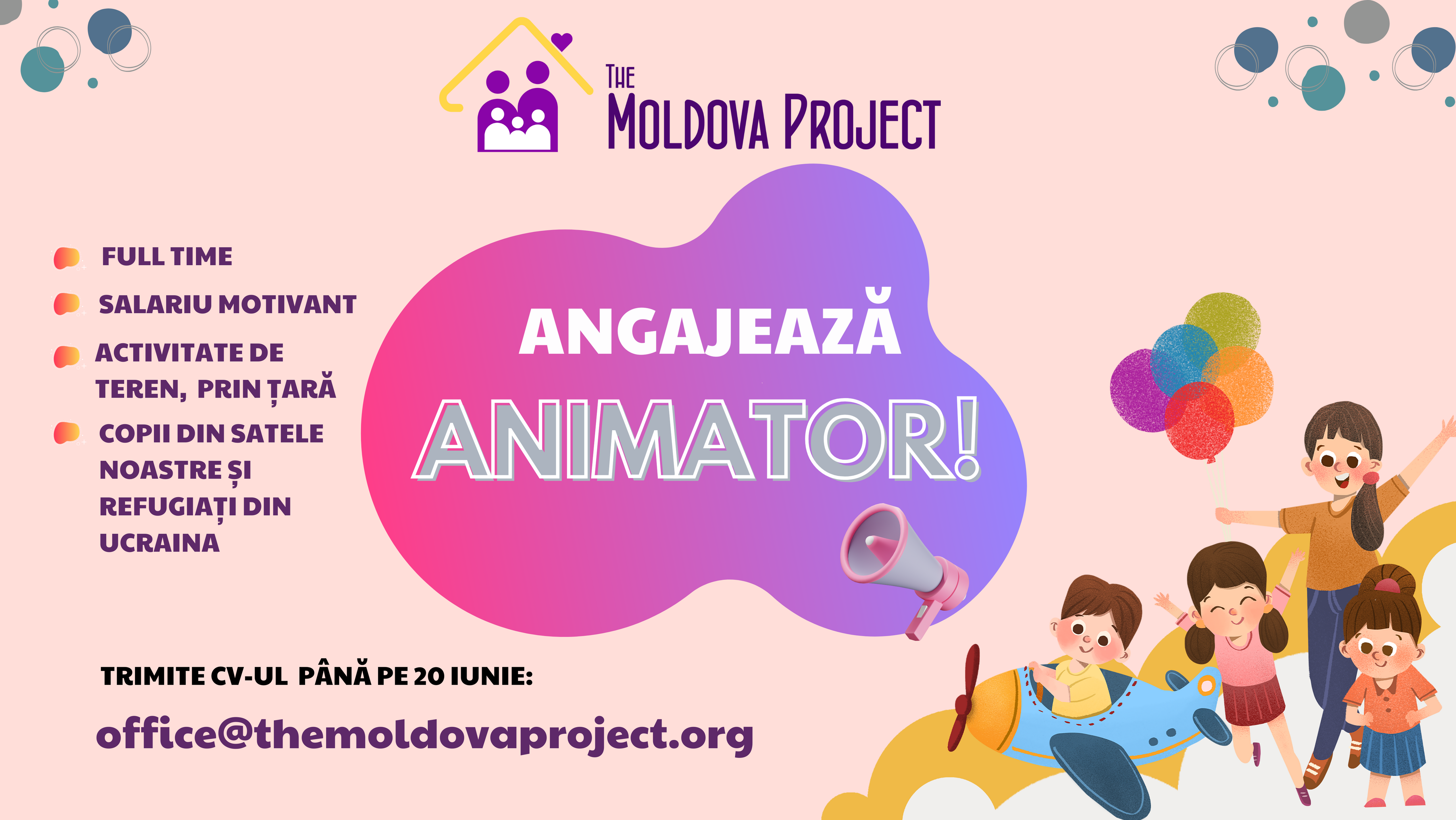 Asociația Obștească „The Moldova Project” anunţă concurs de angajare pentru funcția ANIMATOR SOCIO-EDUCATIV