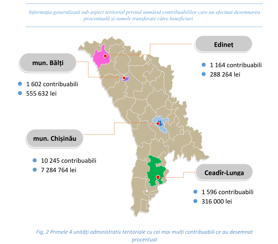 Anul trecut, de cele mai multe desemnări cu cele mai mari sume au beneficiat organizaţiile cu sediul în mun. Chişinău. Deşi contribuabilii cu reşedinţa în mun. Chişinău au desemnat circa 50% din suma totală validată, organizaţiile beneficiare din mun. Chişinău au primit cea mai mare parte din sumă, peste 10 milioane de lei. În anul 2024, suma totală direcționată societăți civile prin acest mecanism a fost puțin  peste 14, 5  milioane de lei.