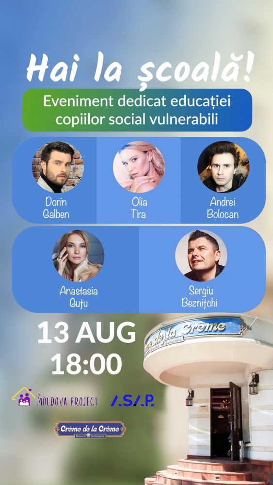Evenimentul caritabil “Hai la Școală” va avea loc la data de 13 august, orele 18:00 – 21:00, în incinta localului Creme de la Creme din strada Alexandru cel Bun 98A. Conceptul evenimentului este unul inedit, și aparține Companiei de marketing “ASAP Digital” în cadrul acțiunii sale de responsabilitate social-corporativă. Punctul principal de atracție îl reprezintă participarea unor persoane publice în calitate de chelneri. După ce vor participa la o scurtă instruire, eroii serii vor servi vizitatorii localului timp de 3 ore, iar tipsurile colectate de ei vor fi donate cauzei evenimentului. În paralel, vor fi colectate fonduri și prin intermediul unei licitații de obiecte (picturi și păpuși) confecționate de copiii beneficiari, cu sprijinul art-terapeutului Asociației TMP. Atmosfera evenimentului va fi una elegantă dar degajată în același timp, cu